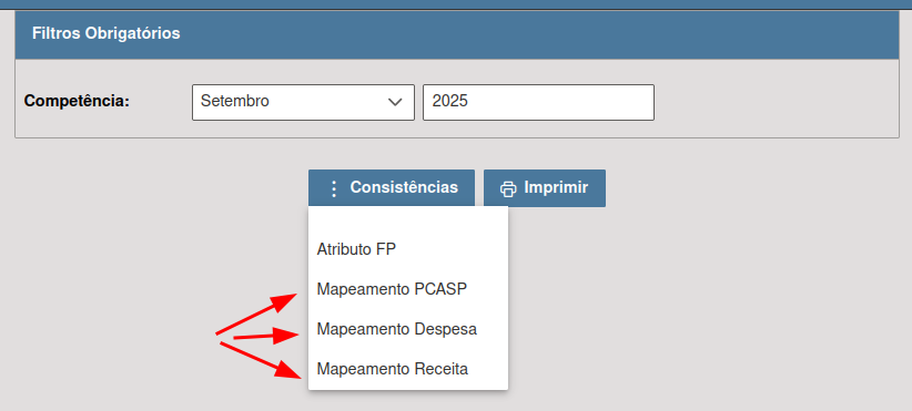 Além disso, é possível imprimir uma validação do superávit financeiro das contas, na seleção "Atributo FP", o sistema identifica as contas contábeis que estão com o atributo errado, em comparação ao plano de contas padrão: