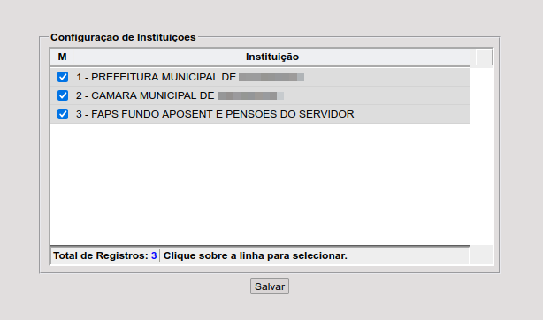Para realizar a operação, o usuário deverá acessar o menu “FINANCEIRO > Contabilidade > Procedimentos > Matriz de Saldos Contábeis > Configurações > Instituições”, marcar as desejadas e clicar no botão “Salvar”.