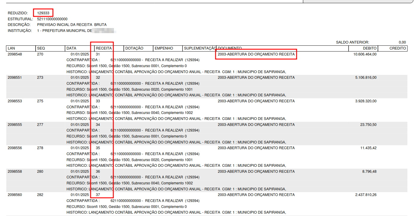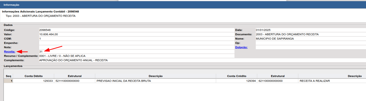 Caso tenha alguma dúvida do lançamento ou receita vinculada ao mesmo, consulte o lançamento para identificar o estrutural: