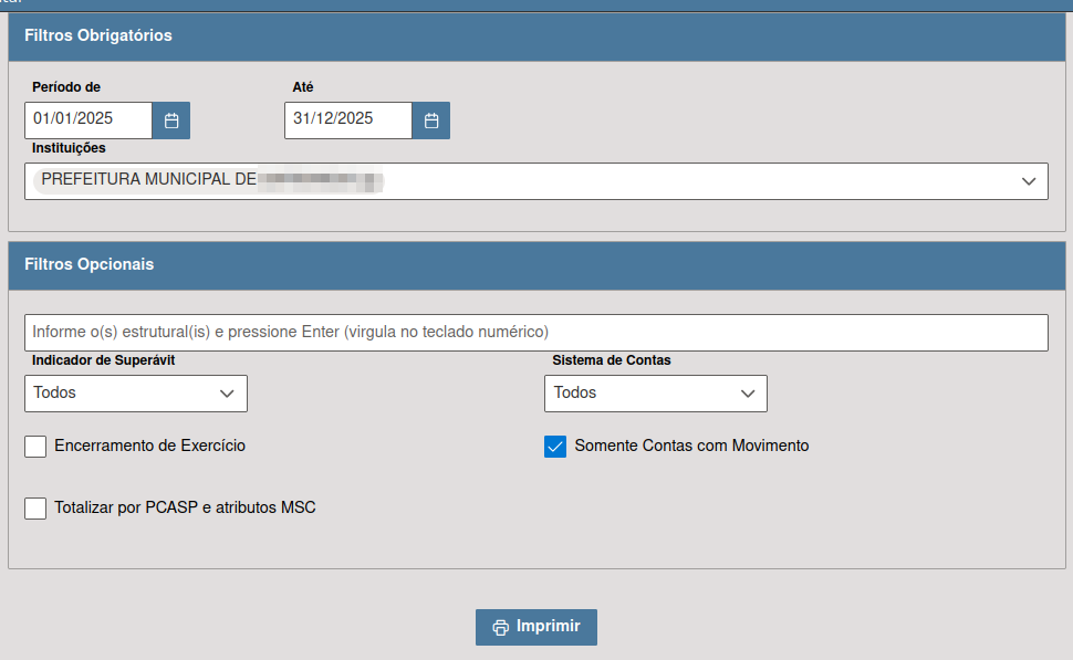 É possível fazer o filtro da conta contábil nos filtros Opcionais, bem como o indicador de Superávit, e o Sistema de contas;