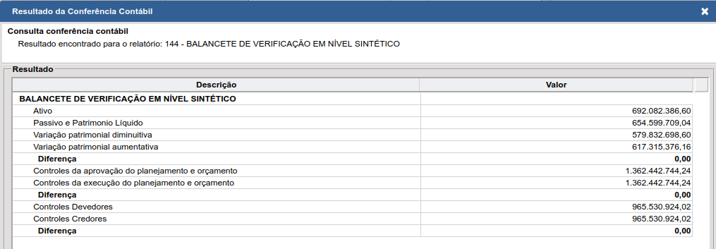 Primeiramente, identifique se há a mesma diferença no balancete de verificação do sistema, pela consistência do Balancete de Verificação Sintético: