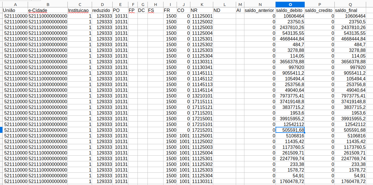 São os valores propriamente ditos dos saldos e movimentações das contas contábeis dentro de um determinado período. Importante ressaltar que os valores das movimentações devem ser informados sem separadores de milhares e utilizado como separador de decimais o ponto “.”. Assim, não deve ser utilizada a vírgula “,”. Além disso, não é permitido o carregamento de valores negativos.