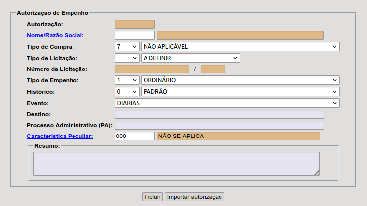 2) EMPENHOS > PROCEDIMENTOS > AUTORIZAÇÃO DE EMPENHO > INCLUSÃO