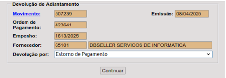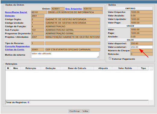 Neste caso, basta apenas buscar o empenho, colocar o motivo da devolução e confirmar. o sistema calcula automaticamente o valor que foi pago menos o valor da prestação para apresentar o valor em tela. Por fim, o empenho fica com os lançamentos já citados acima: