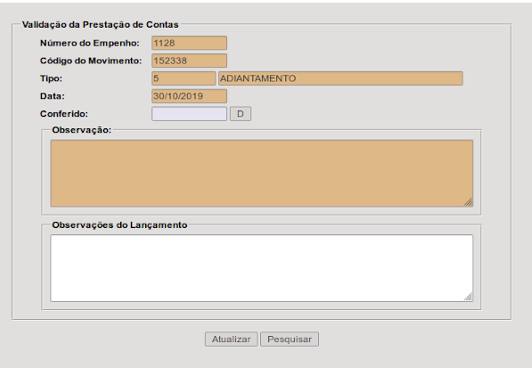 EMPENHOS > PROCEDIMENTOS > PRESTAÇÃO DE CONTAS > CONFERÊNCIA > VALIDAÇÃO