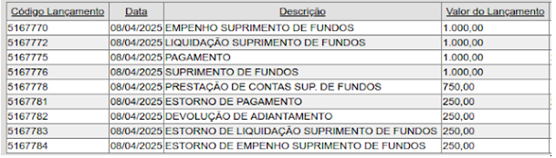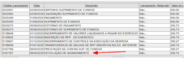 Se executar o estorno de pagamento antes da prestação de contas executará o evento 6 – Estorno Pagamento e também 91 – Estorno Suprimento de fundos.