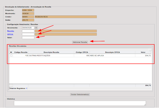 A opção de arrecadação de receita é para devolução de adiantamento de anos anteriores. Por exemplo: O adiantamento foi realizado no ano de 2024 e sua devolução foi no ano de 2025, nestes casos só aparecerá a opção de Arrecadação de receita (o combobox fica bloqueado nesta opção):