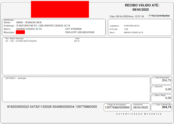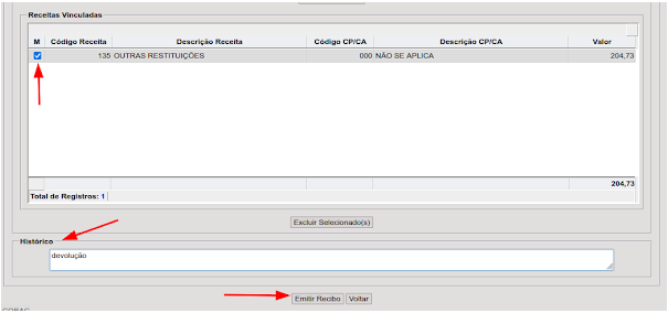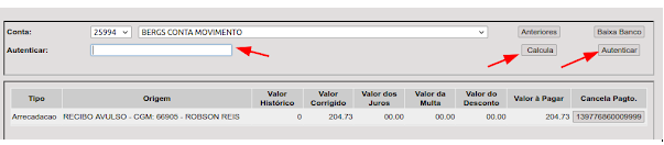 Após incluir o recibo deve-se autenticá-lo na rotina de arrecadação de receita: