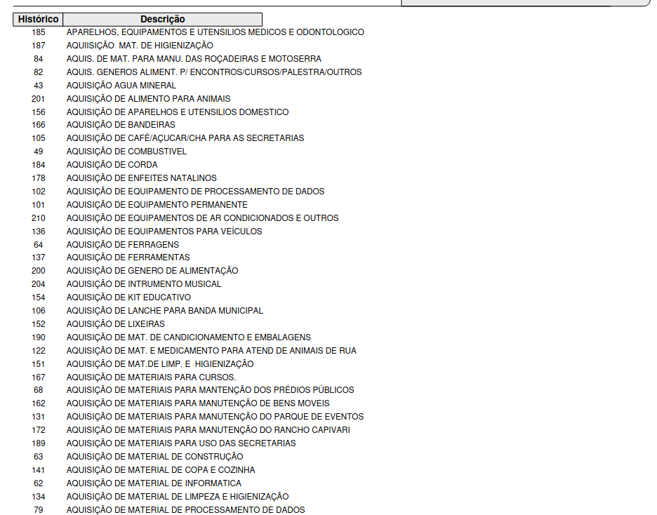 Relatório que mostra o código e a descrição dos históricos cadastrados, para utilização na emissão de empenhos: