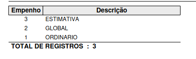 Relatório que mostra o código e a descrição dos tipos de empenhos cadastrados, para utilização na emissão de empenhos: