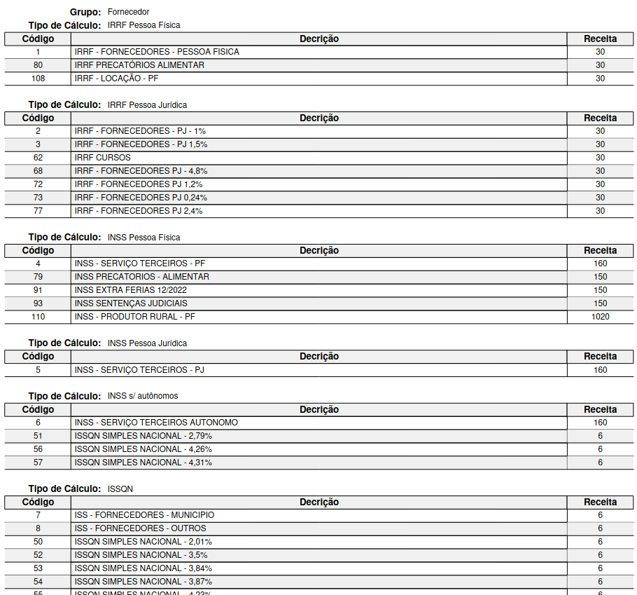 Relatório cadastral de retenções que demonstra pelo grupo de retenções os códigos, descrições e receitas vinculadas: