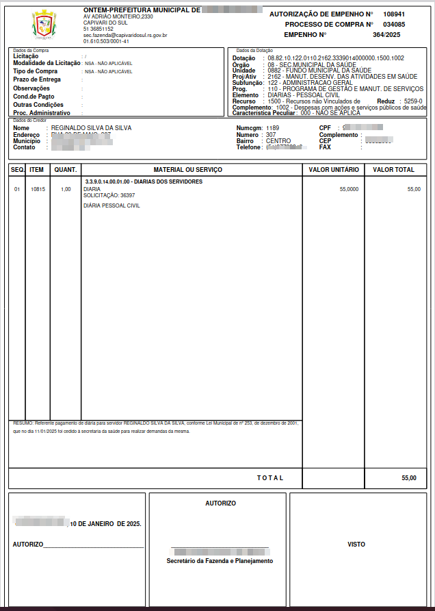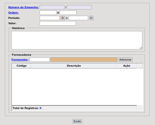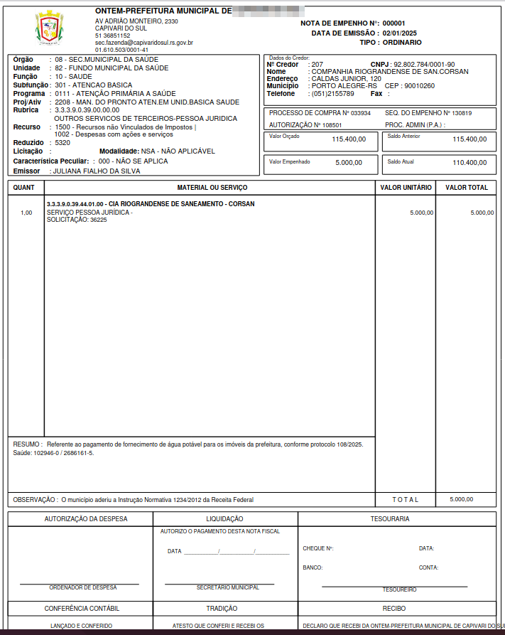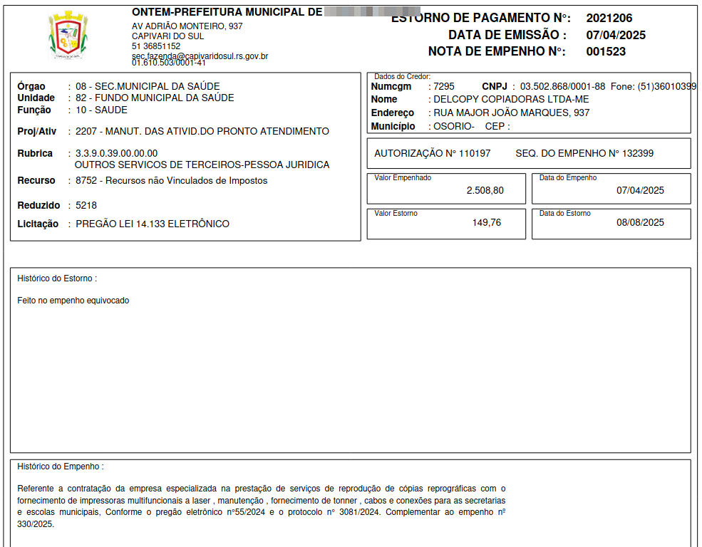 Este documento reemite qualquer ordem de pagamento (liquidação sem ordem de compra) realizada ao longo do ano, pesquise pelo número do empenho, a própria ordem de pagamento, fornecedor ou até mesmo o período de emissão: