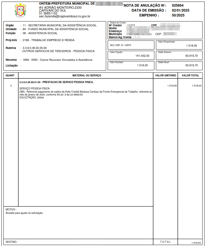 Este documento reemite qualquer anulação de empenho realizado ao longo do ano, pesquise pelo número, sequencial, ou até mesmo o período de emissão: