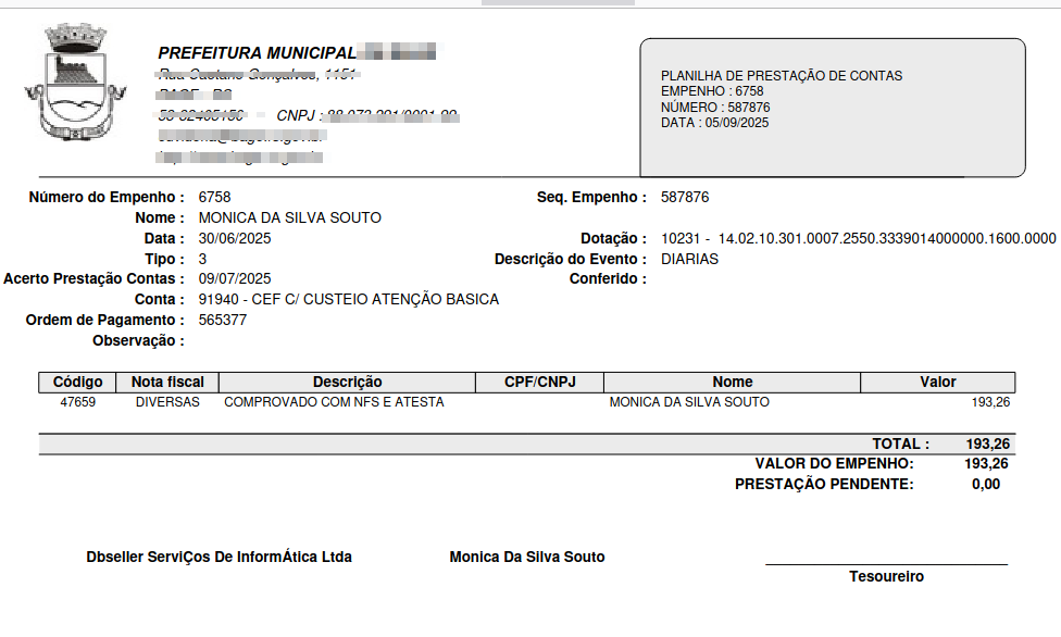 A emissão da prestação de contas é por empenho, como se fosse um documento detalhado dos itens que foram lançados na manutenção do lançamento: