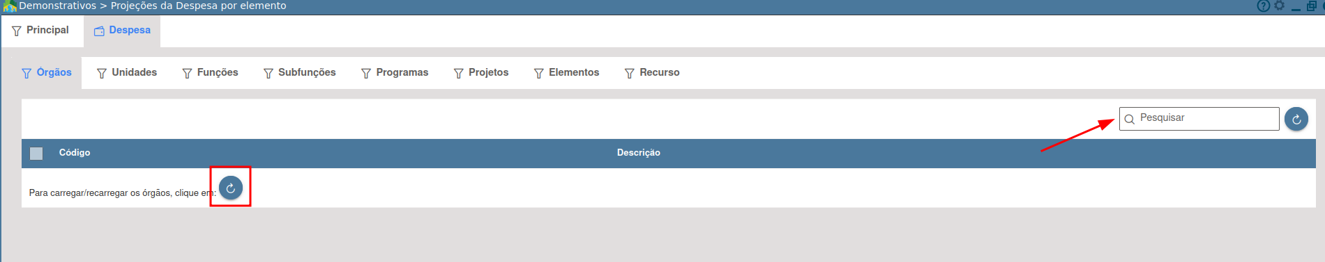 O relatório possui filtros do Orçamento do órgão até o recurso, na aba Despesa; quando acessar a aba, será necessário clicar no ícone , para que o sistema carregue os dados;