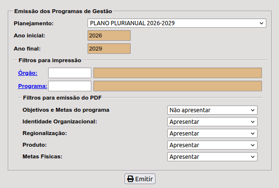 Na emissão dos programas de Gestão, serão demonstrados detalhes dos programas e das iniciativas vinculadas a ele apenas. Pode-se também filtrar o programa ou o órgão para emissão e também se deseja que seja demonstrado a Regionalização, Produto da Iniciativa e as Metas físicas das Iniciativas.