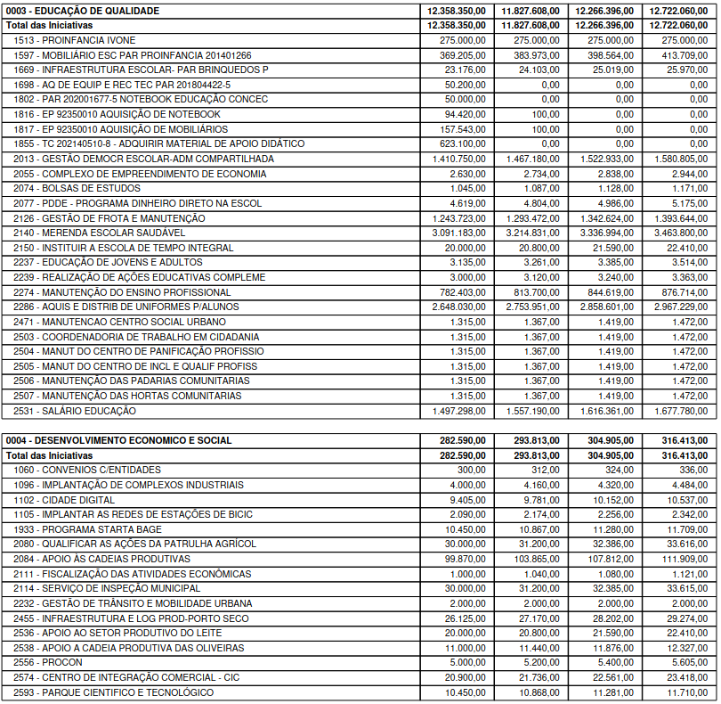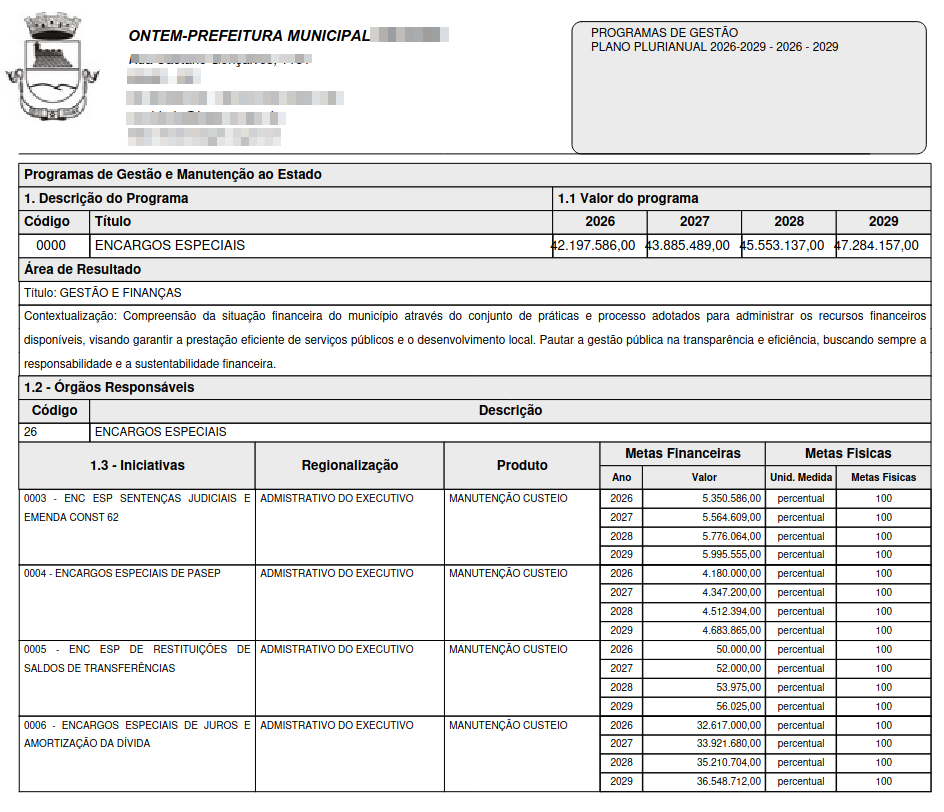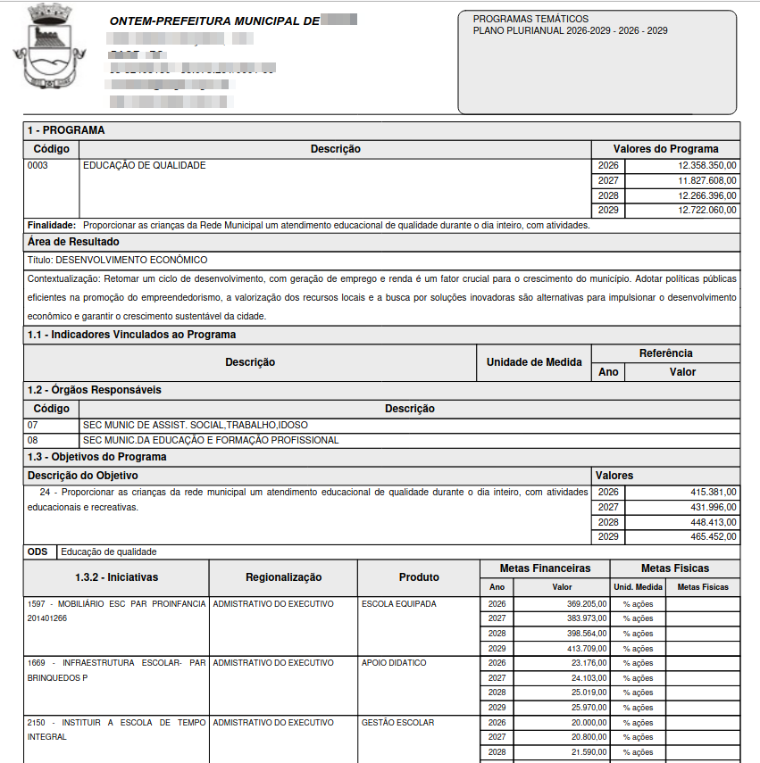 Quando o Plano de governo é o PPA, onde são registrados valores apenas nos Programas e Iniciativas (ações) o relatório irá demonstrar os valores até este nível, primeiramente apresentando o Programa, os órgãos e os objetivos, após são detalhadas as ações: