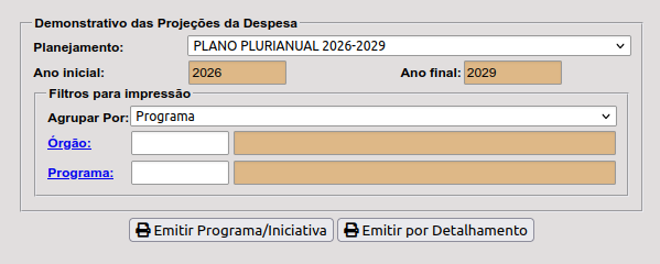 FINANCEIRO > Planejamento > Relatórios > Demonstrativos > Projeções da Despesa