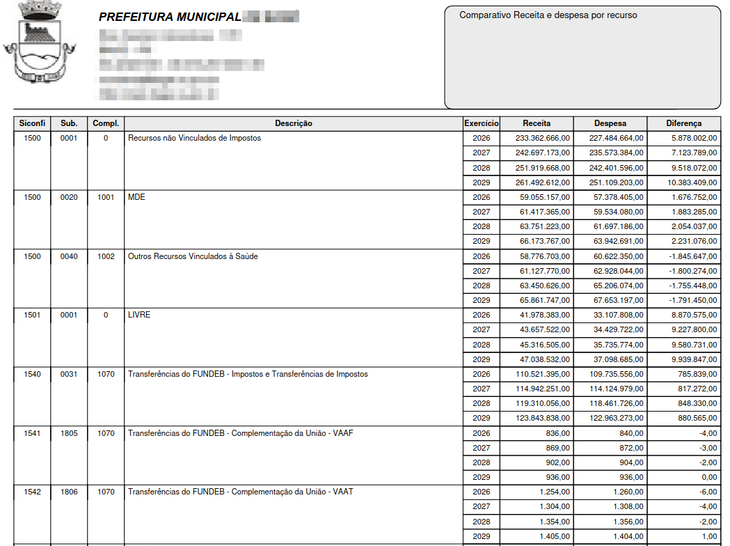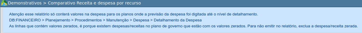 FINANCEIRO > Planejamento > Relatórios > Demonstrativos > Comparativo Receita e despesa por recurso