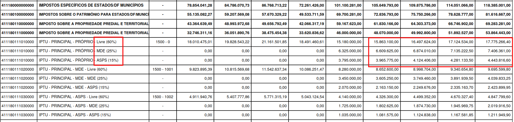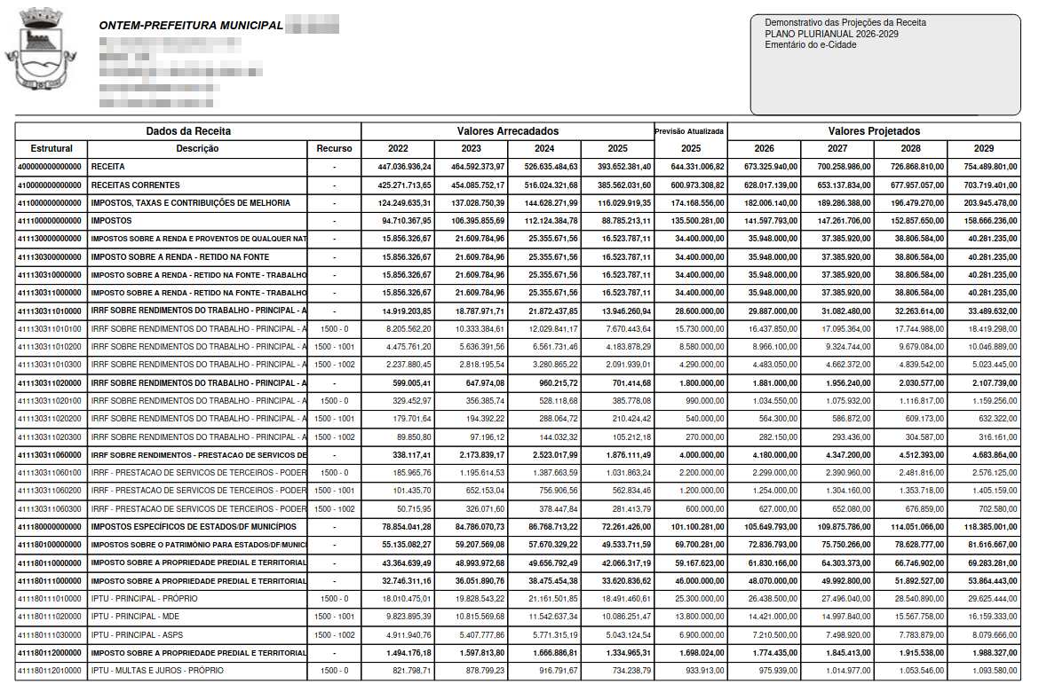 1 - Emissão das projeções normalmente, com as naturezas de receita, os valores arrecadados de 4 anos anteriores, (para se basear) o valor base, que é a previsão atualizada e os valores projetados: