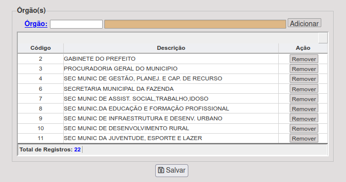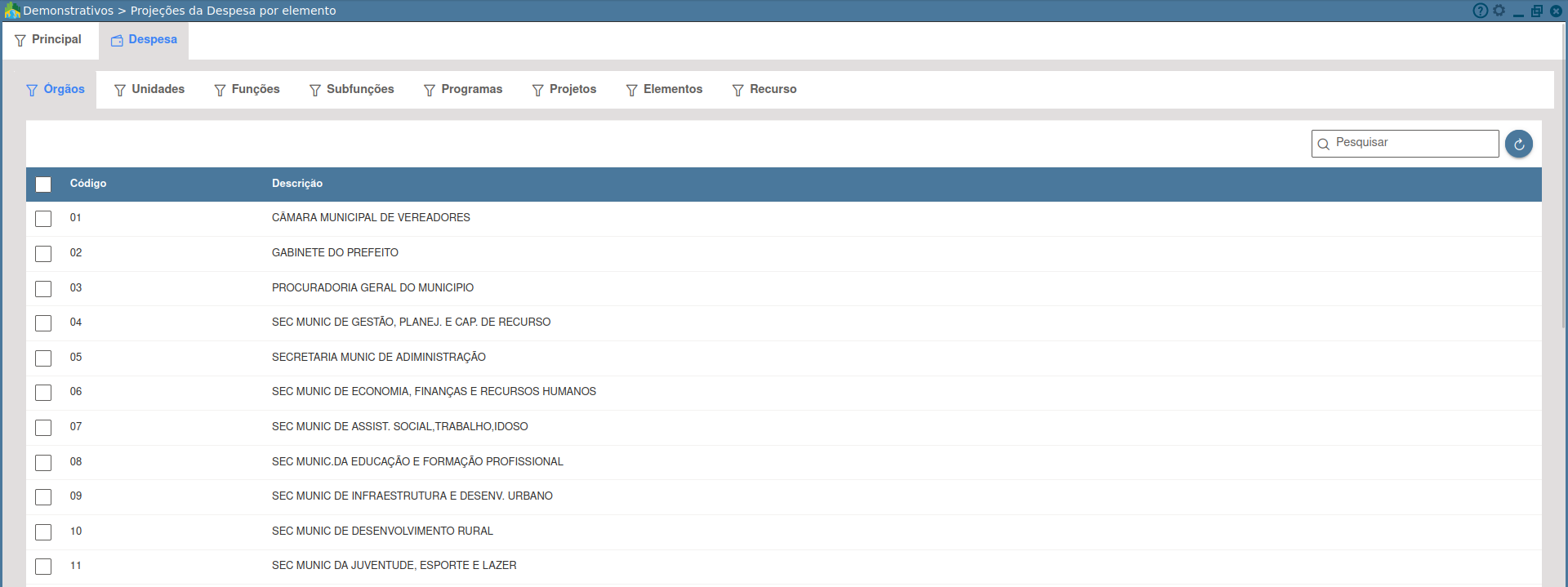 Na caixa "Pesquisar", pode ser colocado qualquer texto ou número, se abaixo estiver o dado pesquisado, o sistema irá recarregar a tela e poderá ser selecionado todos, isso vale para todas as abas, desde o órgão até o recurso;