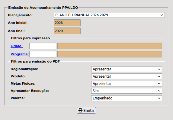 FINANCEIRO > Planejamento > Relatórios > Demonstrativos > Acompanhamento do PPA/LDO