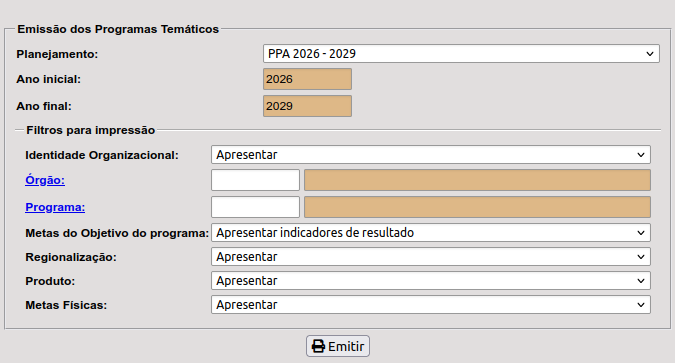 Pode-se filtrar por programa e se deseja apresentar os indicadores de resultado das metas; Além disso, pode-se também filtrar por órgão para emissão e também se deseja que seja demonstrado a Regionalização, Produto da Iniciativa e as Metas físicas das Iniciativas.