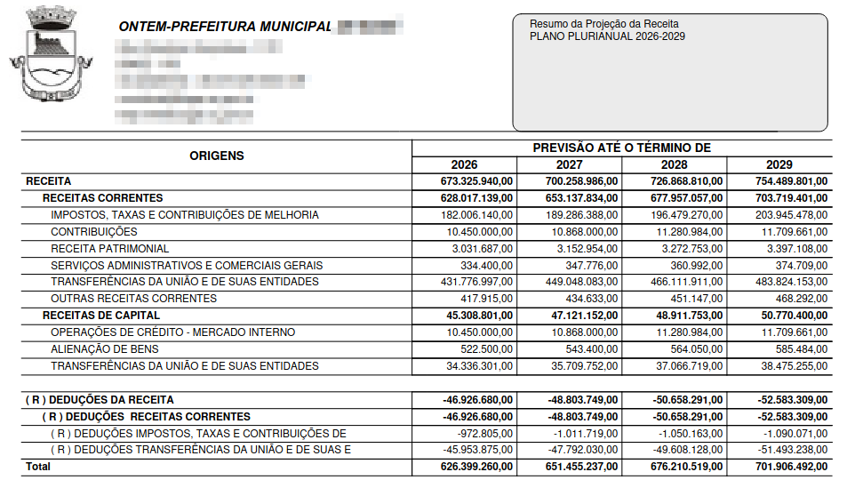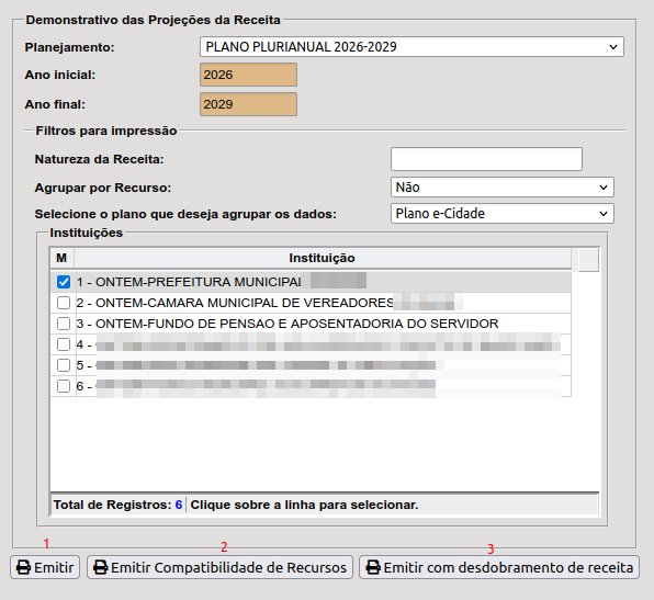 2 - Emissão das projeções com a compatibilidade de recursos, com as naturezas de receita, o valor base, que é a previsão atualizada e os valores projetados: