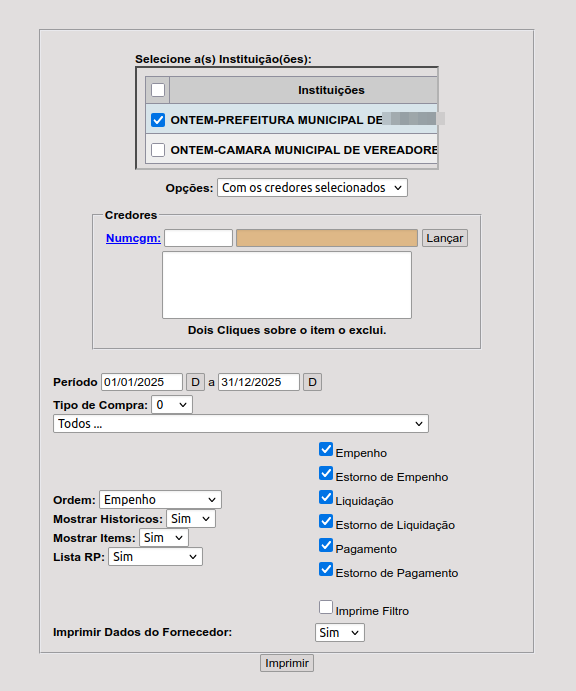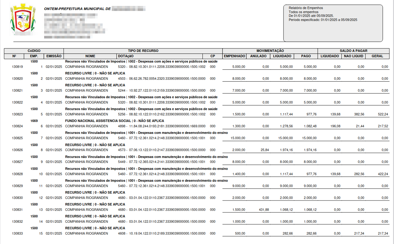 Este relatório visa demonstrar a movimentação de empenhos de uma forma mais detalhada, possibilitando que a emissão seja separada por tipo de movimentação, empenhado, liquidado ou pago. Podendo ainda escolher o credor, se deseja demonstrar o histórico do empenho, os itens e se quer que liste restos a pagar:
