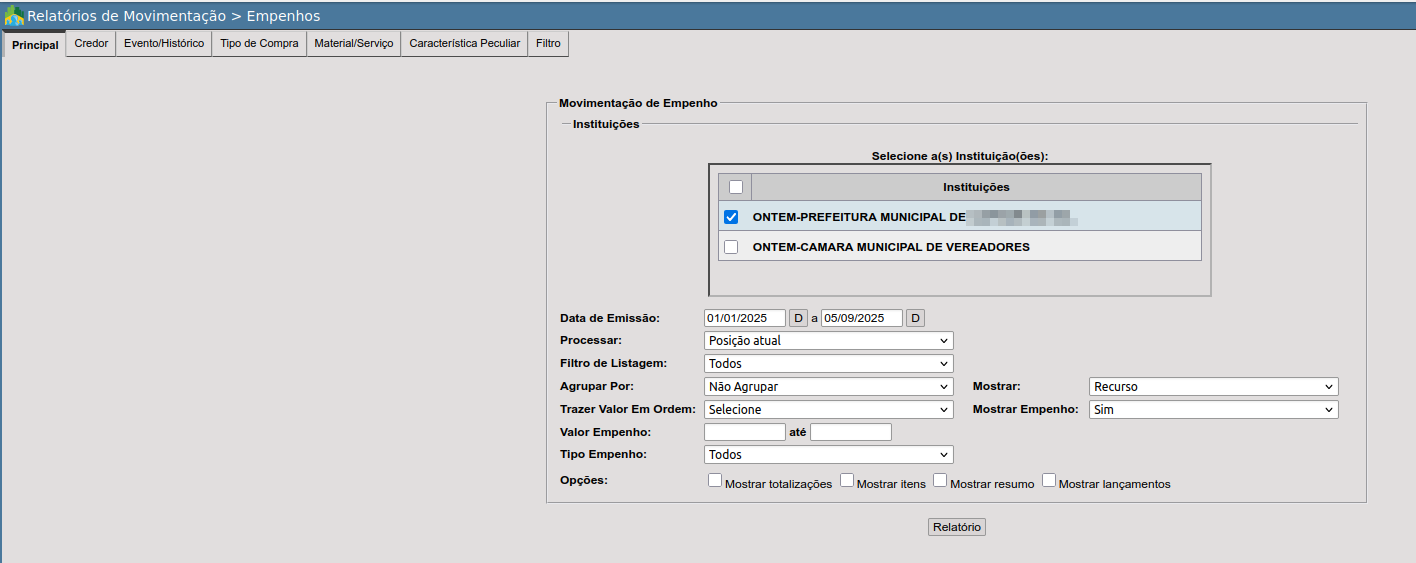 Este relatório é o mais completo de relação de empenhos, traz toda a movimento dos empenhos no período desejado com várias possibilidades de filtro, como credor, evento, tipo de compra, material/serviço, característica peculiar, além de toda a funcional programática da dotação; além dos filtros em tela: