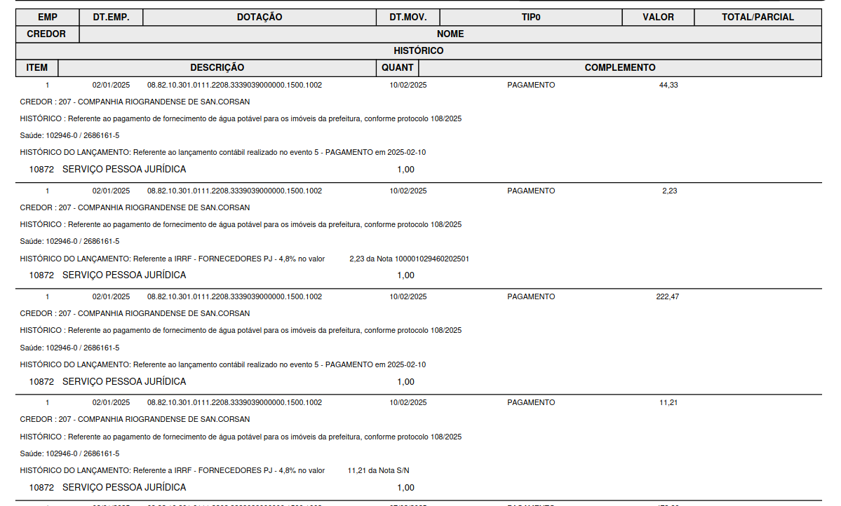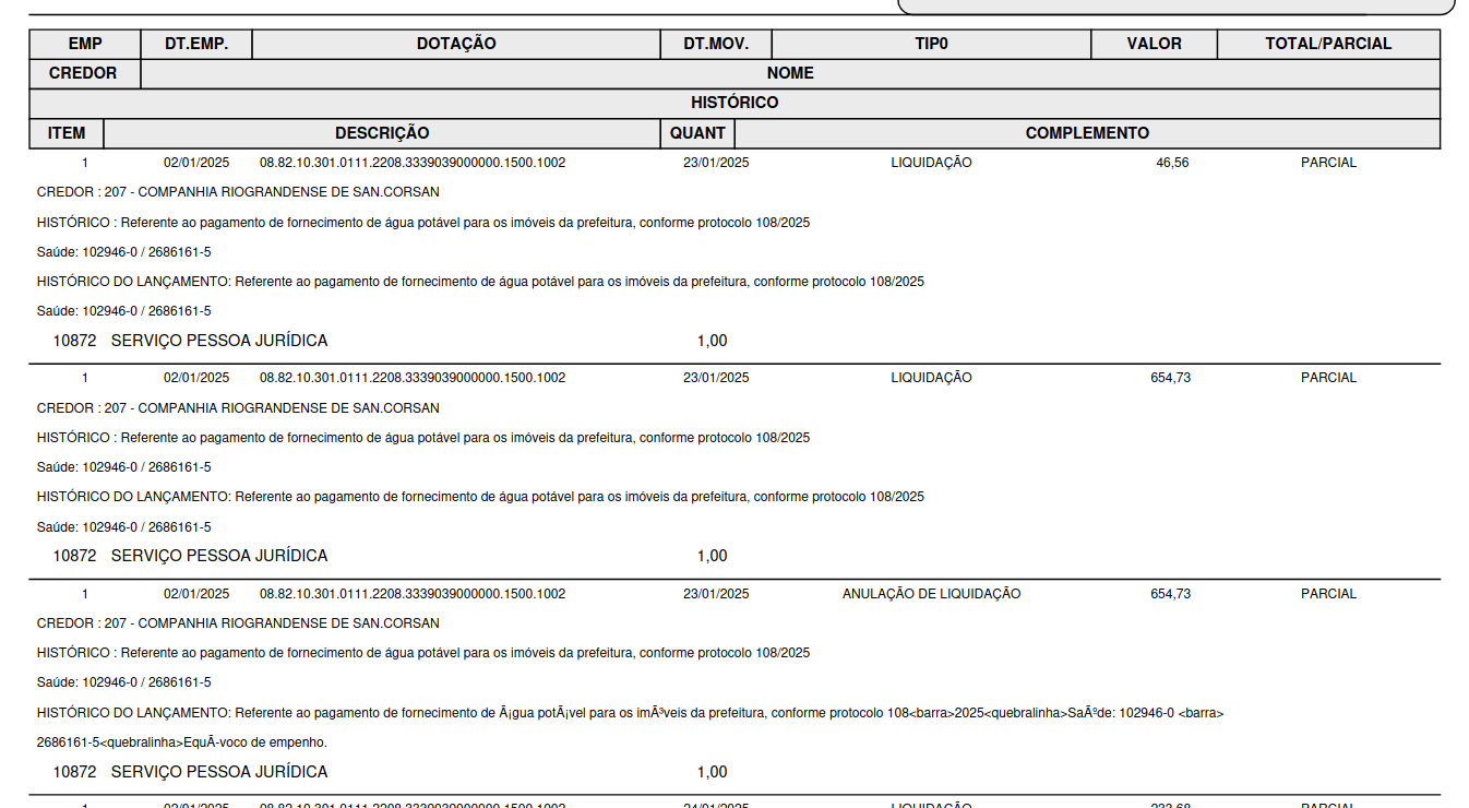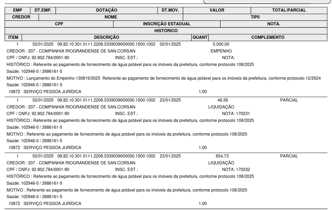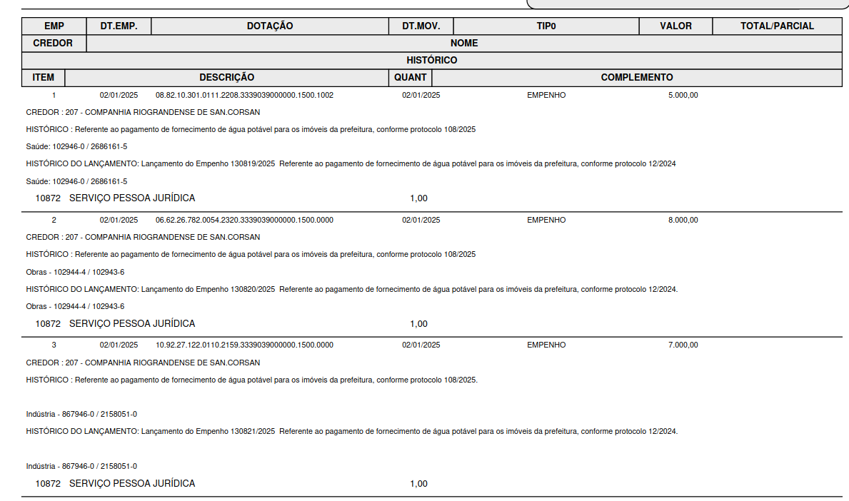 Exemplo de impressão completo, com histórico, itens e valores empenhados