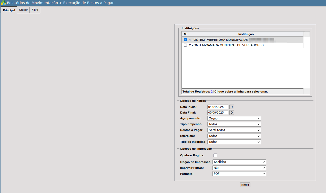 MÓDULO > EMPENHO > RELATÓRIOS > RELATÓRIOS DE MOVIMENTAÇÃO > EXECUÇÃO DE RESTOS A PAGAR