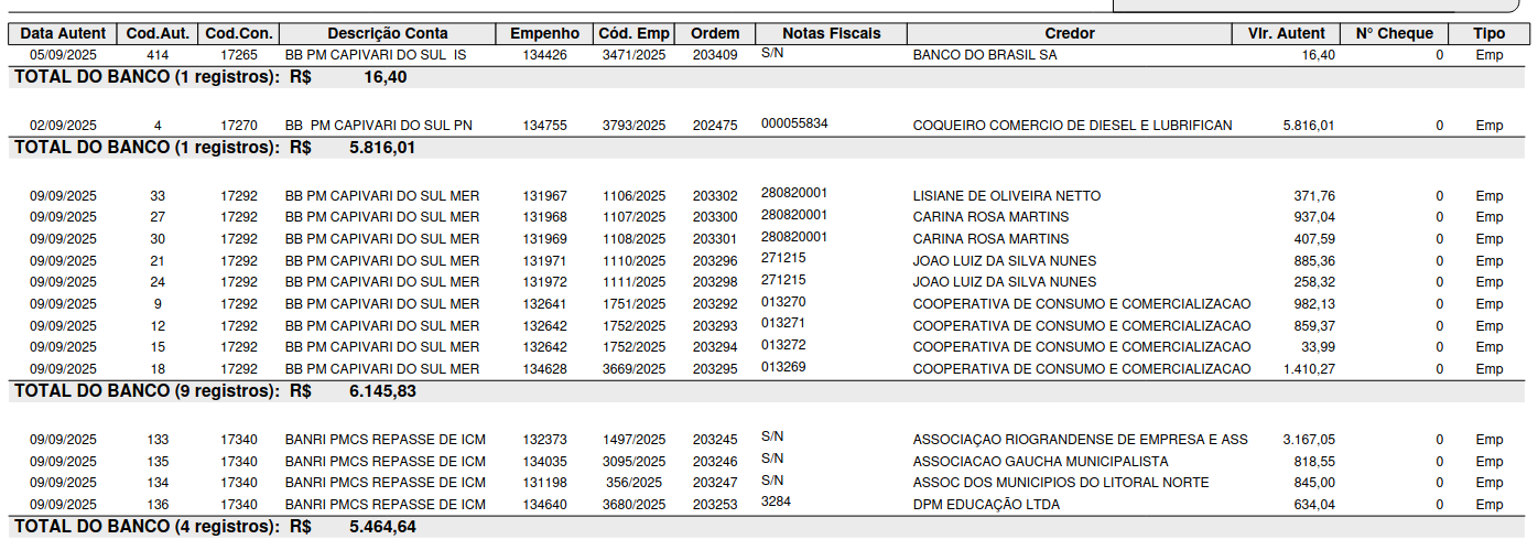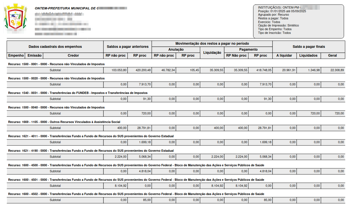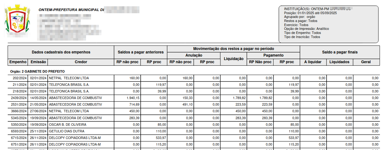 Este relatório traz toda a movimentação dos restos a pagar os período desejado com várias possibilidades de filtro, como exercício, tipo de restos, além de outros.