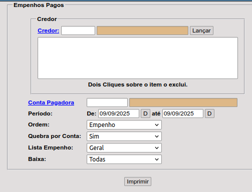 Relatório de empenhos pagos, onde podemos filtrar o credor, a conta pagadora, selecionar a ordem a ser emitido, se deseja listar todos os empenhos do exercício e/ou de restos a pagar e até pelo tipo de baixa (valor líquido pago ou valor retido):