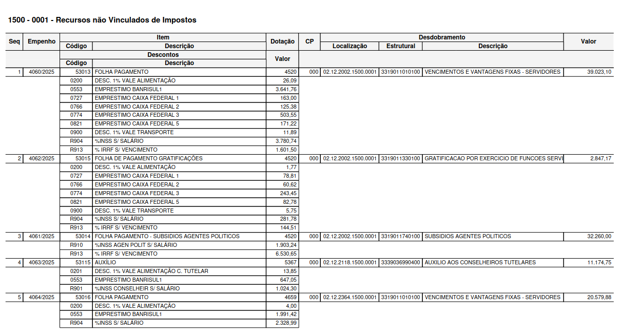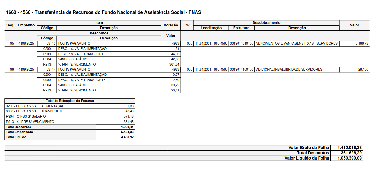 Exemplo de impressão onde a Folha de pagamento está calculada e os empenhos estão gerados