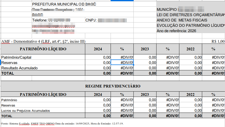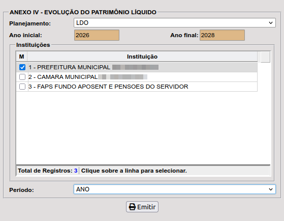 FINANCEIRO > Planejamento > Relatórios > Anexo de Metas e Riscos Fiscais > Dem. IV - Evolução do Patrimônio Líquido