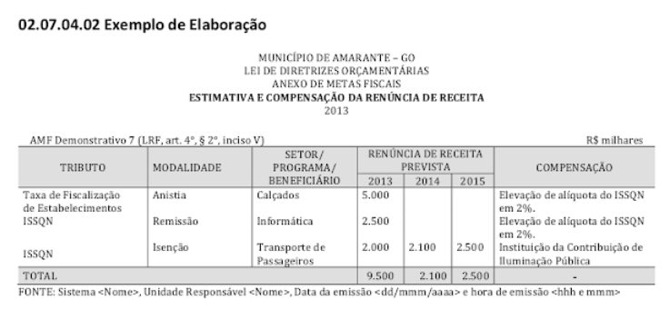O Demonstrativo identifica os tributos para os quais estão previstos renúncias de receita, destacando-se a modalidade da renúncia (anistia, remissão, subsídio, crédito presumido, etc), os setores/programas/beneficiários a serem favorecidos, a previsão da renúncia para o ano de referência da LDO e para os dois exercícios seguintes, e as medidas de compensação pela perda prevista de receita com a renúncia.” (Pág 136 do MANUAL DE DEMONSTRATIVOS FISCAIS – ANEXO DE METAS FISCAIS 11ª edição)