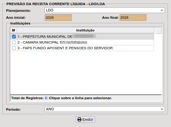 FINANCEIRO > Planejamento > Relatórios > Anexo de Metas e Riscos Fiscais > Outros Anexos > Previsão da Receita Corrente Líquida - LDO/LOA
