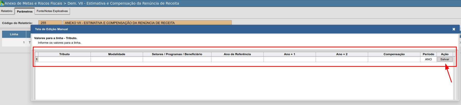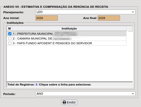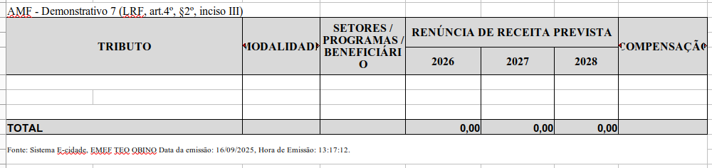 FINANCEIRO > Planejamento > Relatórios > Anexo de Metas e Riscos Fiscais > Dem. VII - Estimativa e Compensação da Renúncia de Receita