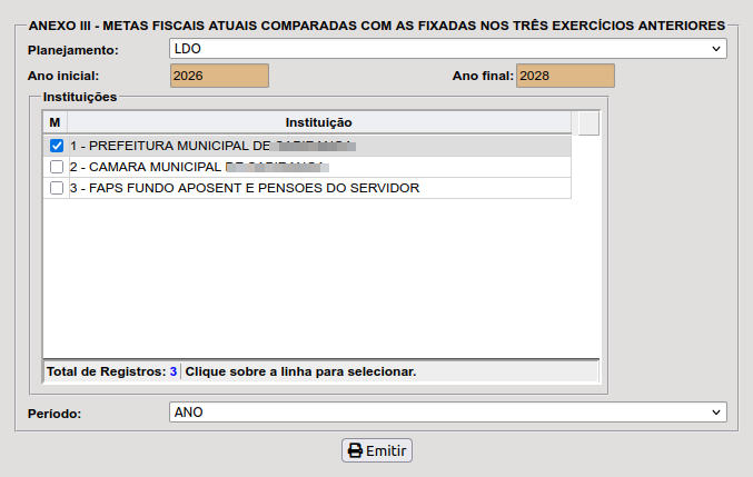 FINANCEIRO > Planejamento > Relatórios > Anexo de Metas e Riscos Fiscais > Dem III - Metas Atuais Comparadas três exercícios anteriores