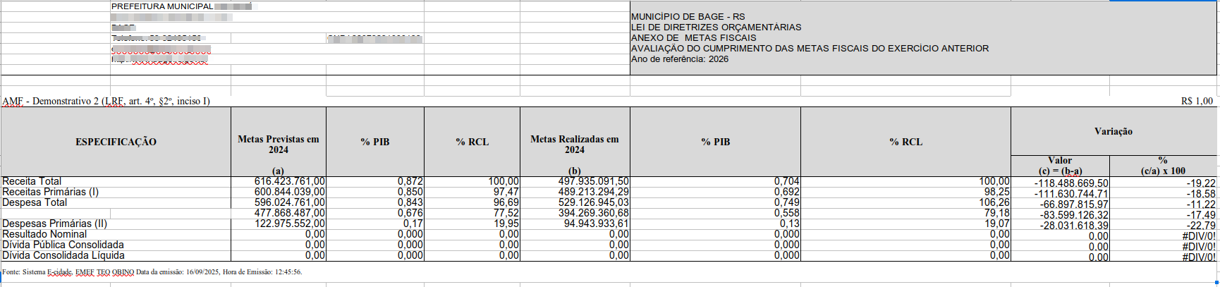 Além destes relatórios que já estão disponíveis desde o PPA, é possível emitir os anexos de Metas e Riscos Fiscais. Todos os anexos têm saída em formato de planilha, para melhor conferência e ajustes.