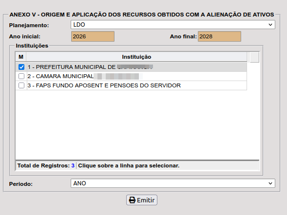 FINANCEIRO > Planejamento > Relatórios > Anexo de Metas e Riscos Fiscais > Dem. V - Origem e Aplicação dos Recursos Obtidos com a Alienação de Ativos