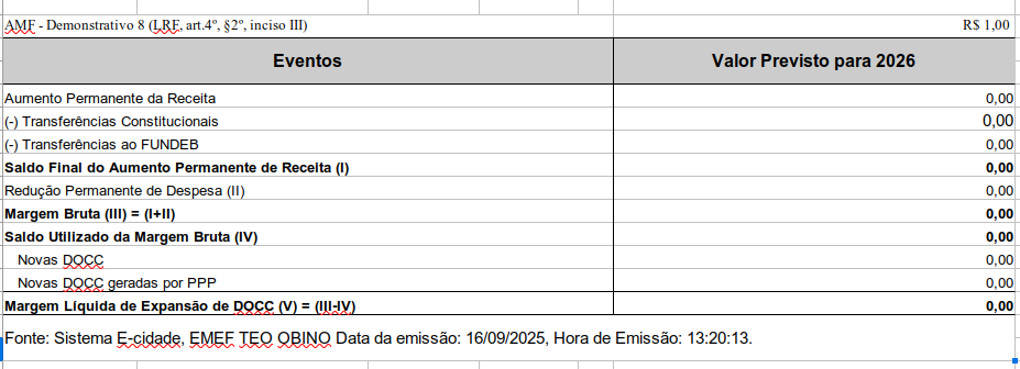 FINANCEIRO > Planejamento > Relatórios > Anexo de Metas e Riscos Fiscais > Dem. VIII - Margem de Expansão das Despesas Obrigatórias de Caráter Continuado