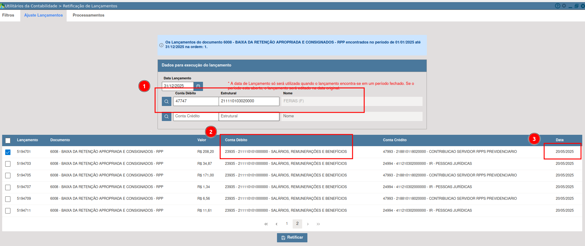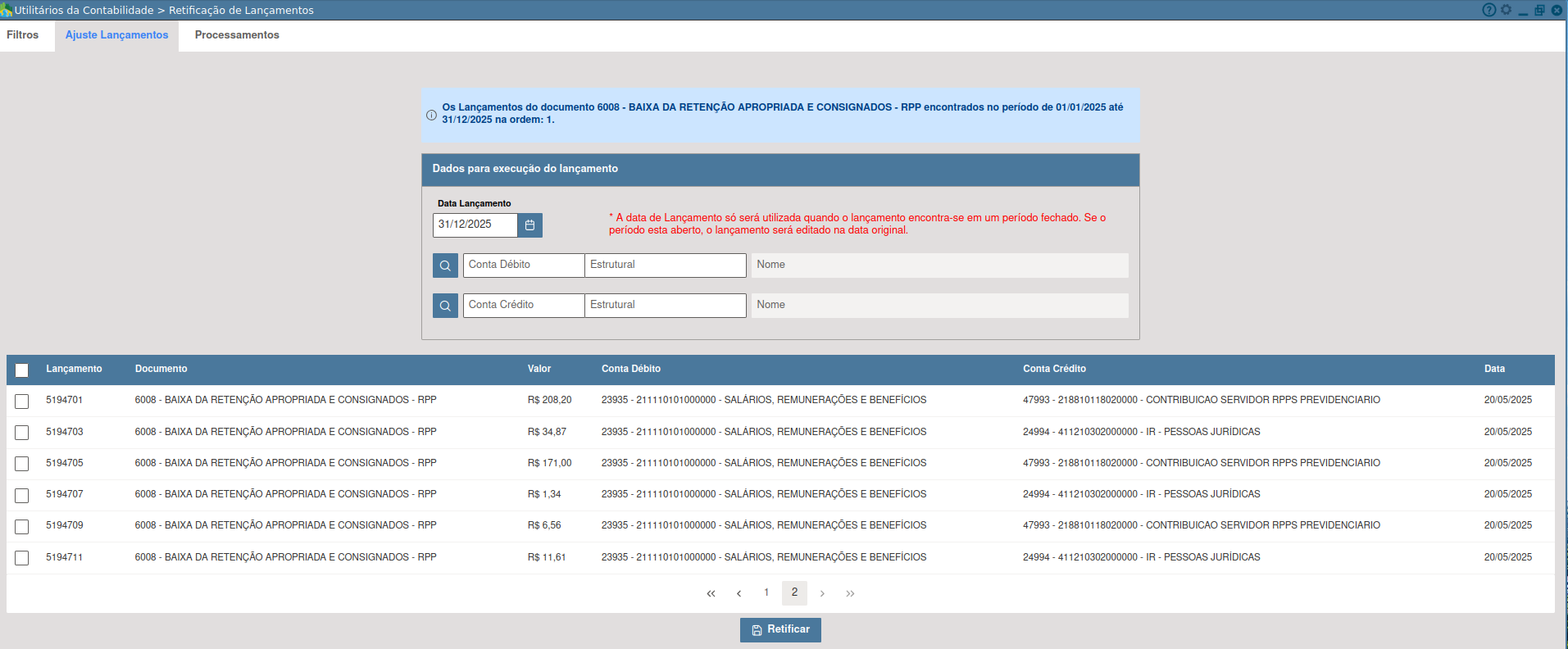 Após selecionar o(s) lançamento(s) desejado(s), clique em Retificar: