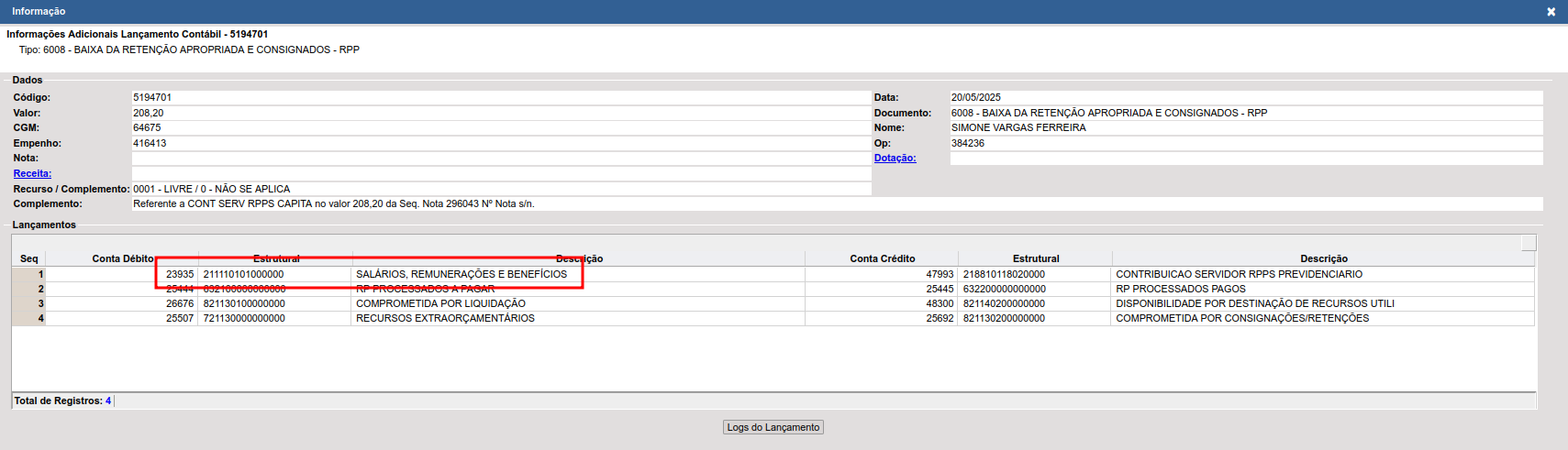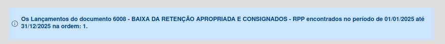 No exemplo acima, foi selecionado o evento 6008 - Baixa de retenção apropriada e consignados - RPP;