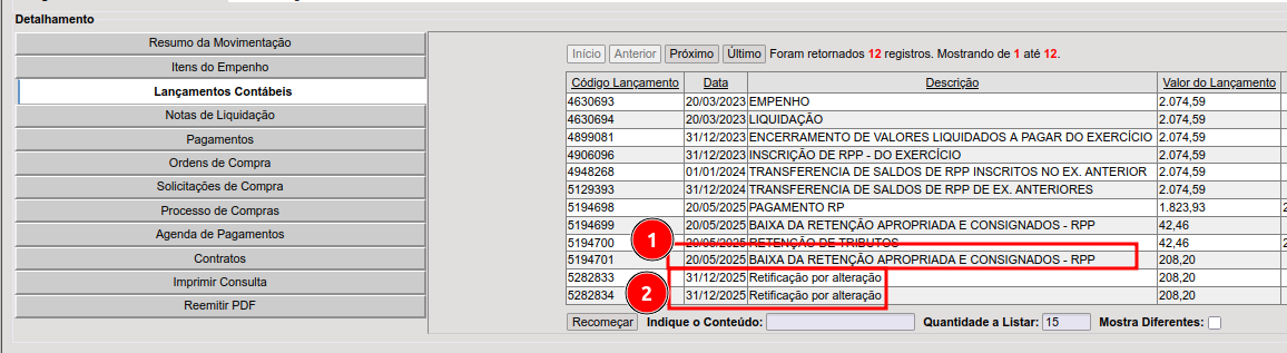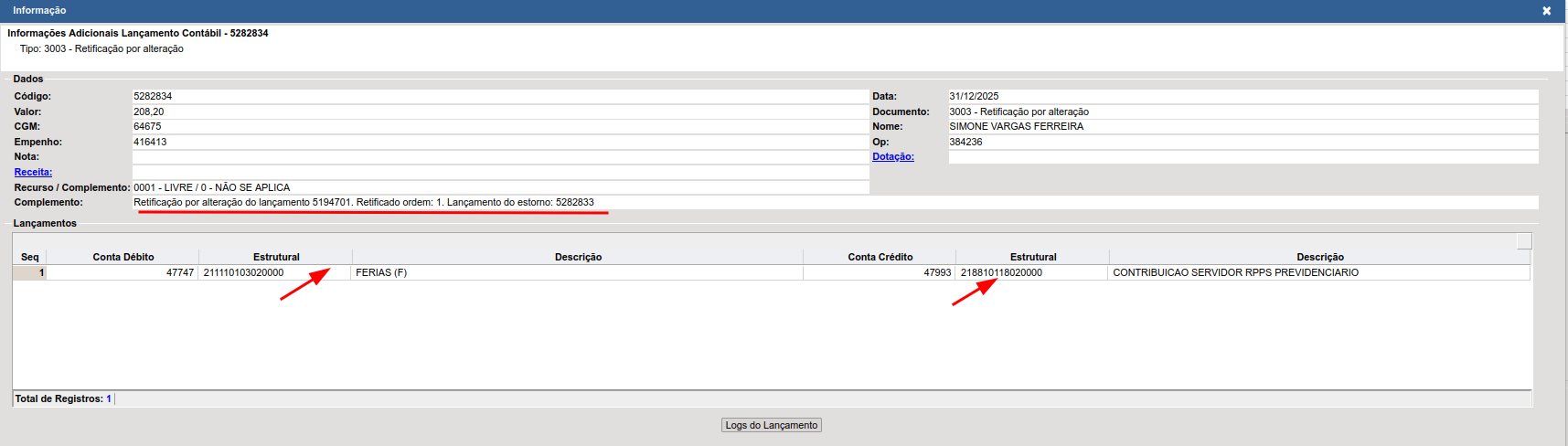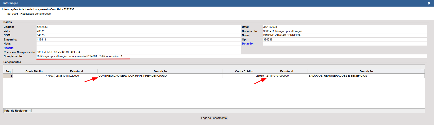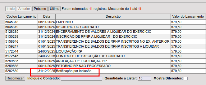 Observe que no histórico do lançamento de retificação, é demonstrado o código do lançamento original, para evidenciais consultas posteriores.