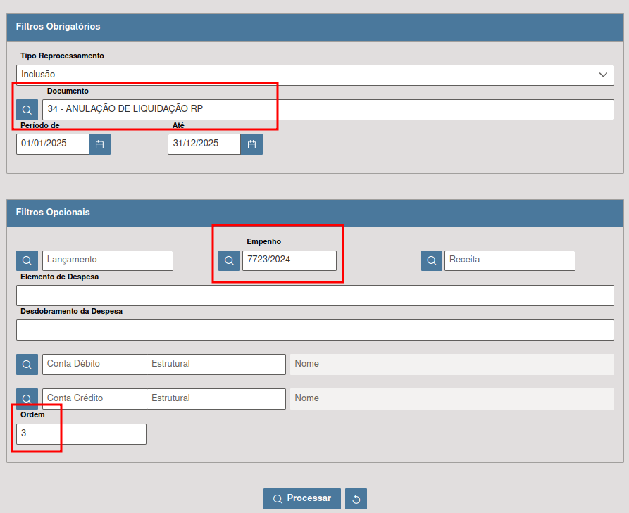 Pode ser filtrado o lançamento, o empenho, a receita, o elemento, o desdobramento, bem como as contas débito e crédito específicas que sofrerão alteração;