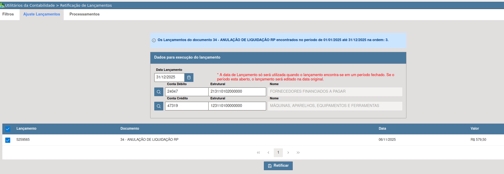 FINANCEIRO > Contabilidade > Procedimentos > Utilitários da Contabilidade > Retificação de Lançamentos
