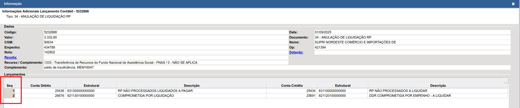 Ao consultar o empenho do lançamento retificado, o mesmo demonstrará os lançamentos novos nos registros contábeis: