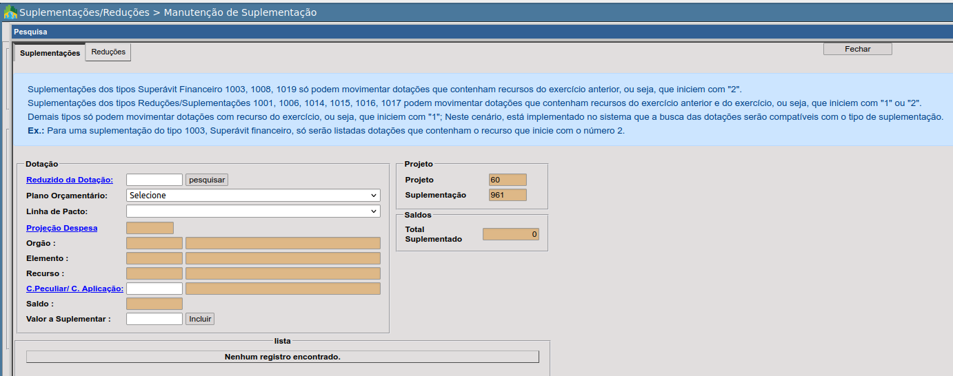 Terminada a inclusão do Decreto, o sistema remeterá automaticamente para a rotina de manutenção de suplementação (menu: ORÇAMENTO > PROCEDIMENTOS > SUPLEMENTAÇÕES/REDUÇÕES > MANUTENÇÃO DE SUPLEMENTAÇÃO), onde o usuário informará os dados das dotações a serem suplementadas, reduzidas e de receitas (no caso dos excessos de arrecadação) da mesma forma costumeiramente adotada. Créditos Suplementares excedendo o Limite autorizado pela LOA. No momento em que o limite definido na LOA for ultrapassado, o Sistema bloqueará a abertura via Decreto dos Créditos Suplementares. A partir daí, deverá ser adotado procedimento idêntico aos Créditos Especiais, ou seja, o encaminhamento de Projeto de Lei para aprovação do Poder Legislativo.